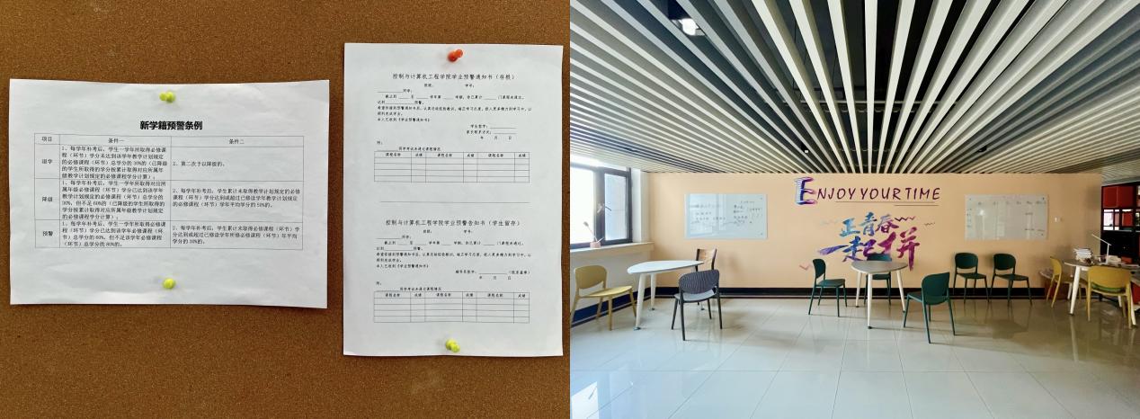 强化制度保障,探索多种学业支持方式。加强对学生学习的日常管理,围绕学生、关照学生、服务学生。彩库宝典 严格落实北京市和学校关于深度辅导和遍访宿舍的要求,每月一次进宿舍,及时关注学生学习和生活情况;同时在彩库宝典 的要求下,进课堂、进考场,每名辅导员每周旁听2节专业课,了解掌握学生学习状态。贯彻课程思政理念,发挥专业课教师在课堂学风塑造、专业深造中的指导作用。充分调动党团学生干部力量,成立学风督查教师小组和学生小组,发挥学生骨干在学风建设中自我教育、自我管理、自我服务作用,一定程度上有效提高了学生出勤率、抬头率。强化诚信考试和警示教育,严格落实考试违纪处理规定,督促学生自觉遵守校规校纪。做好学业预警工作,设置《学籍预警条例》和《学业预警通知书》,为预警学生配备一对一学业辅导员,有针对性开展学业帮扶。加强楼宇文化建设,保障基础条件,在主楼E座走廊空地设置学习区,配备桌椅、白板等学习用品,为学生自习、互动交流创造良好条件。