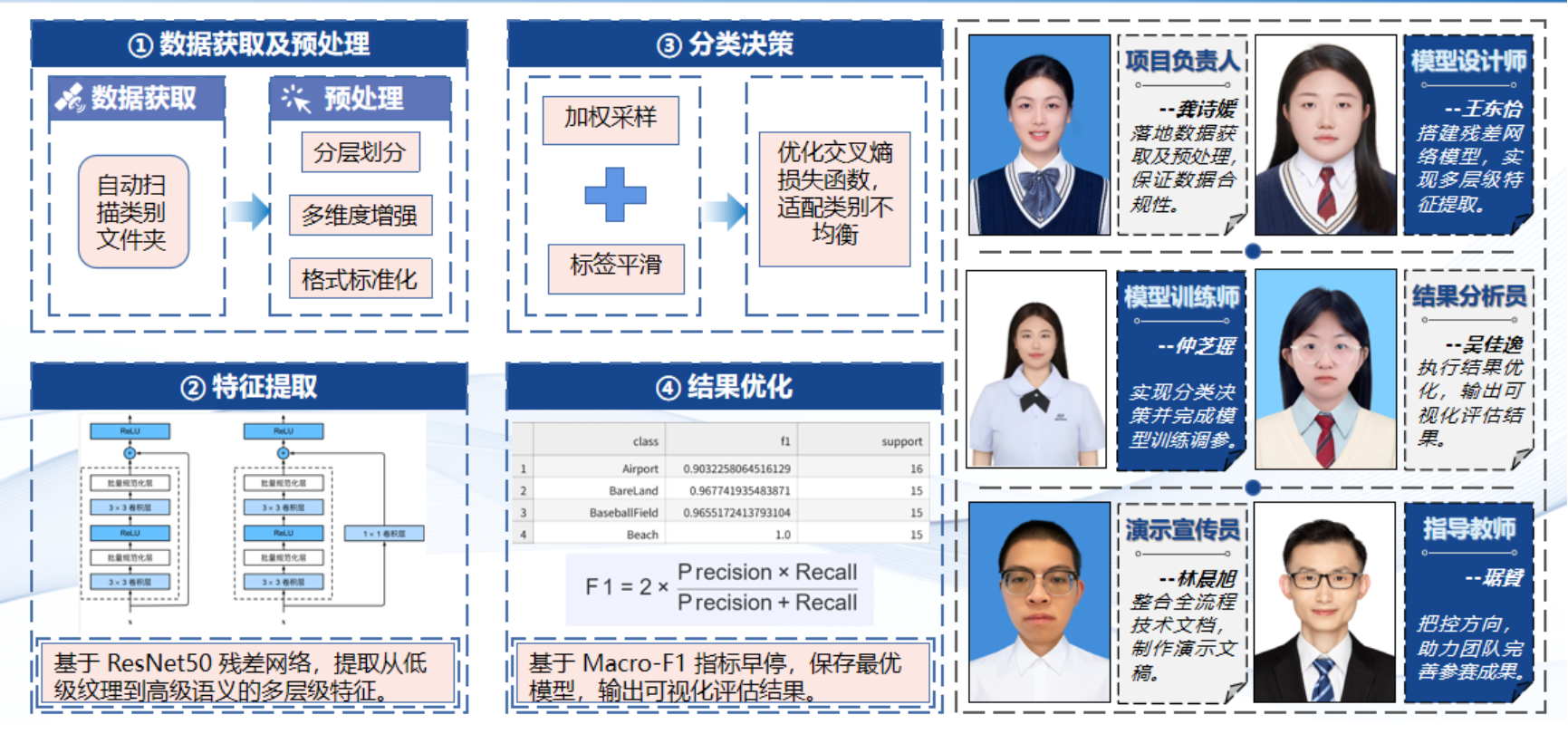 团队立足实际需求,构建了高效的智能分类解决方案。通过分层划分数据集、多维度数据增强等预处理手段平衡样本分布,最终实现了96.5%的分类准确率与96.2%的Macro-F1值,部分类别分类精度达到满分,展现出良好的技术实力。
